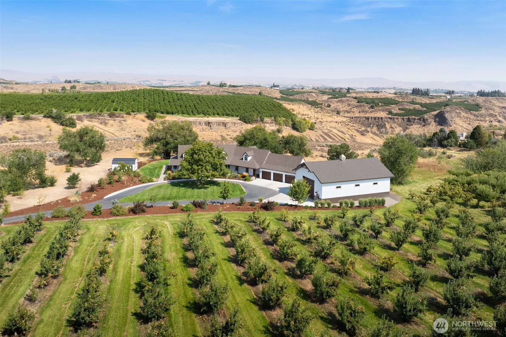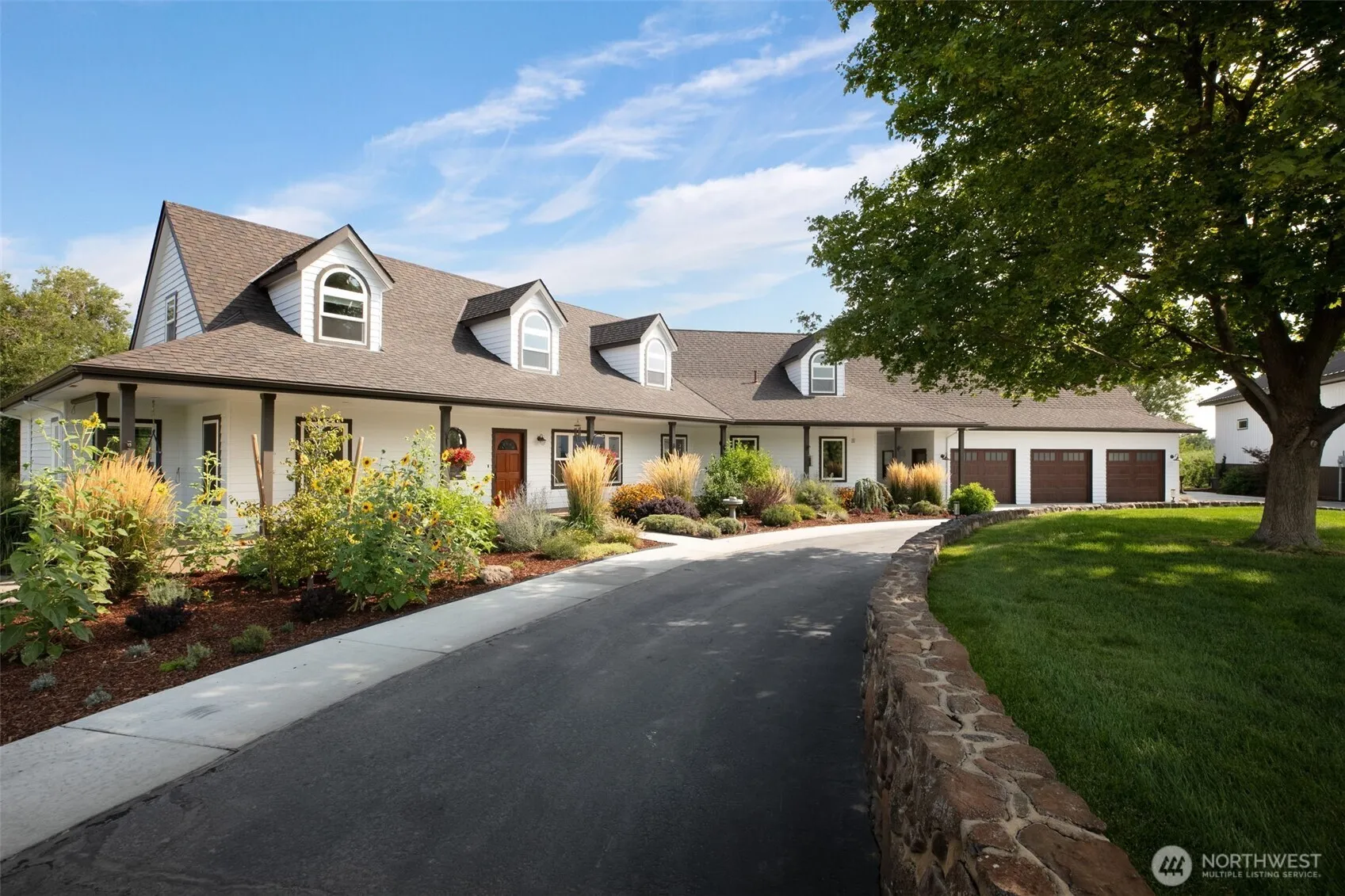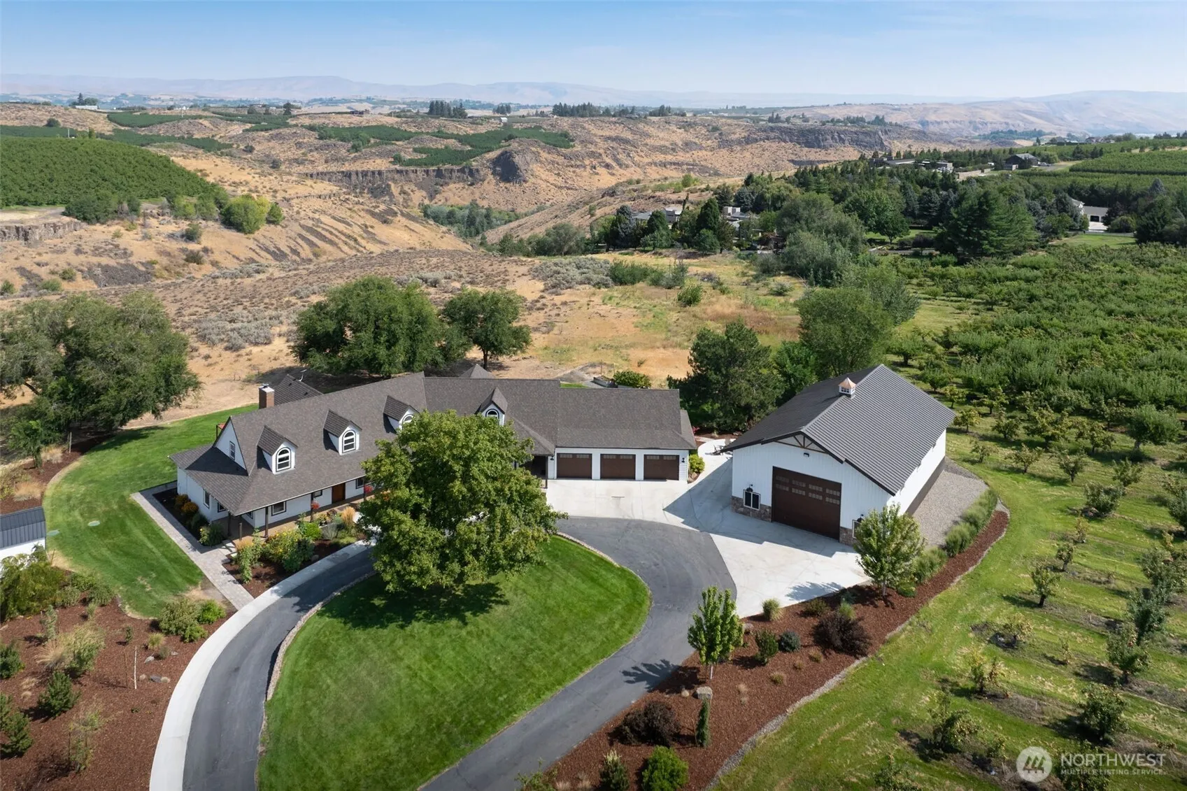 Set on nearly 8.09 acres overlooking Cowiche Canyon, this approx. 4,110 sq. ft. two-story home blends Cape Cod charm with modern farmhouse comfort. A wraparound porch, circle driveway, and manicured landscaping create timeless curb appeal, while apple orchards and natural vegetation surround the property. Inside, hard wood floors flow throughout with custom built-ins, formal and informal living areas, and a kitchen featuring quartz countertops, stainless steel appliances, island gas range, and double oven. The main-level primary suite includes a spa-like bath, while upstairs offers 3 bedrooms and a large bonus room. Outdoor highlights include a pergola-covered patio w/ hot tub, 36’ x 58’ shop with power, and 3-car garage with breezeway.