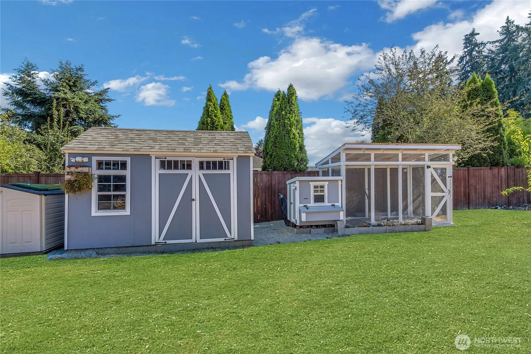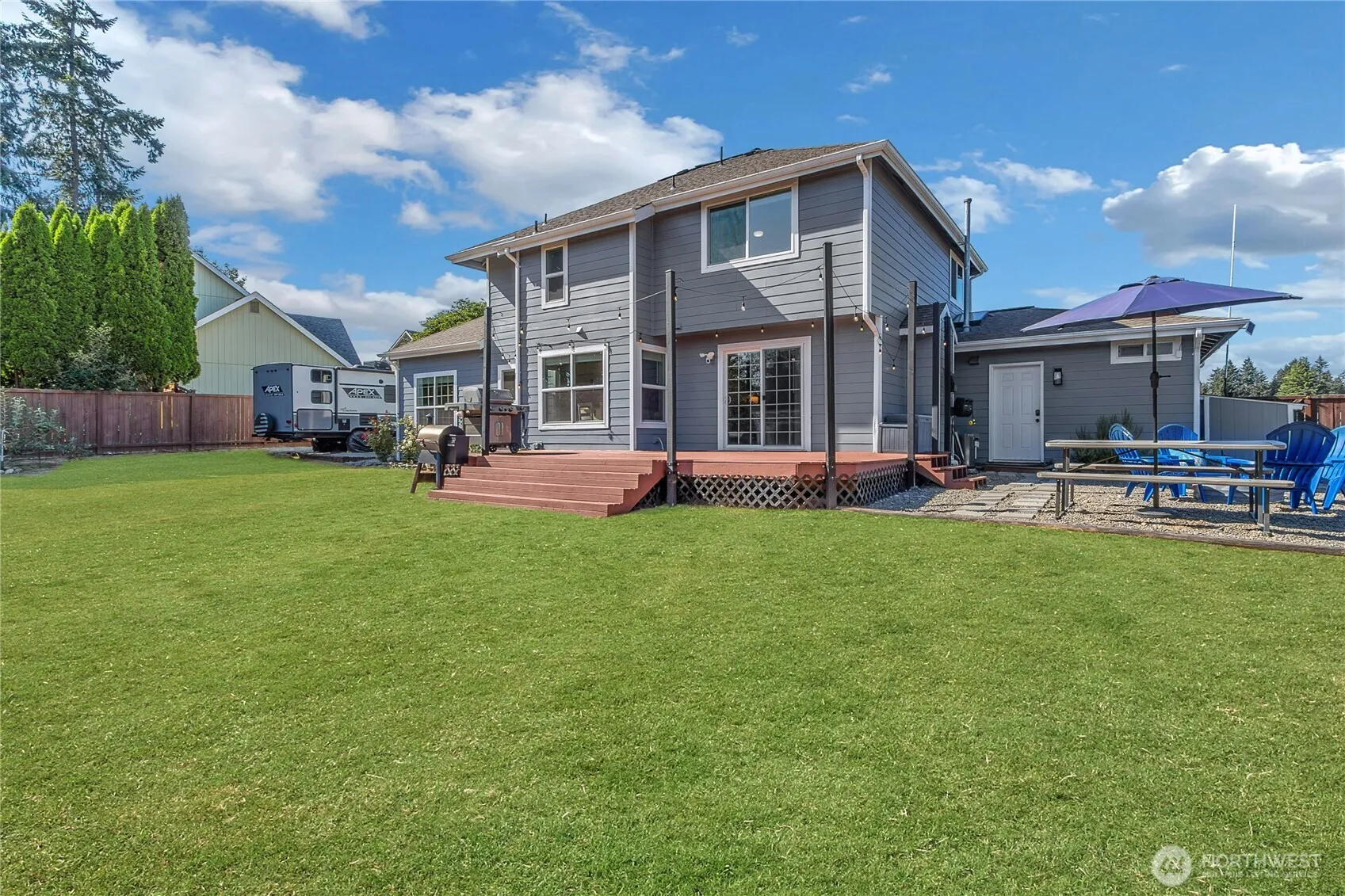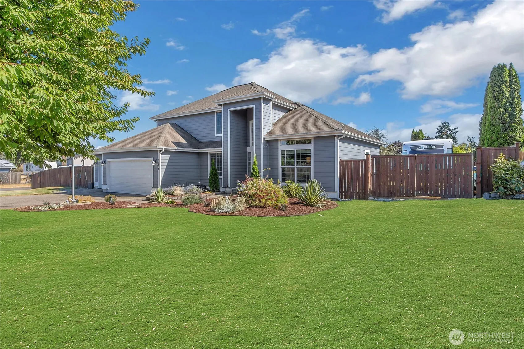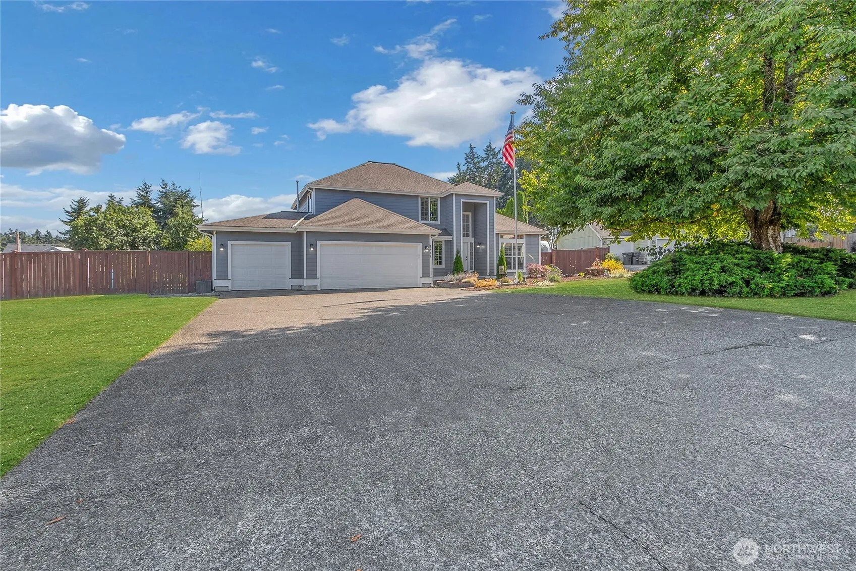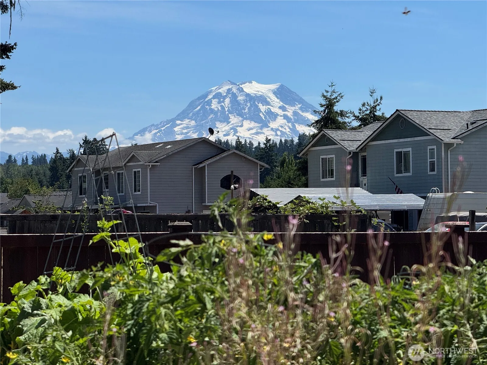 VIEW of MT RAINIER from the back of your freshly updated home that sits on a huge almost 1/2 acre corner lot. 3 bedrms + main level office, family rm, living rm & dining space. Lots of parking including RV parking & 3 car garage.Kitchen has newer appliances, white cabinets w/butcher block counters & island all new this year. All new water lines, faux wood blinds, carpet, inter doors, white moulding, inter lighting, ceiling fans, smart light switches, inter paint throughout & new vapor barrier & insulation in crawl space.Water heater 2022, windows 2018, roof 2019, A/C w/smart thermostat 2022. All bathrms completely updated 2022 & adorable laundry rm 2024. Ask your agent for full upgrade list. Close to shoppings, schools & JBLM