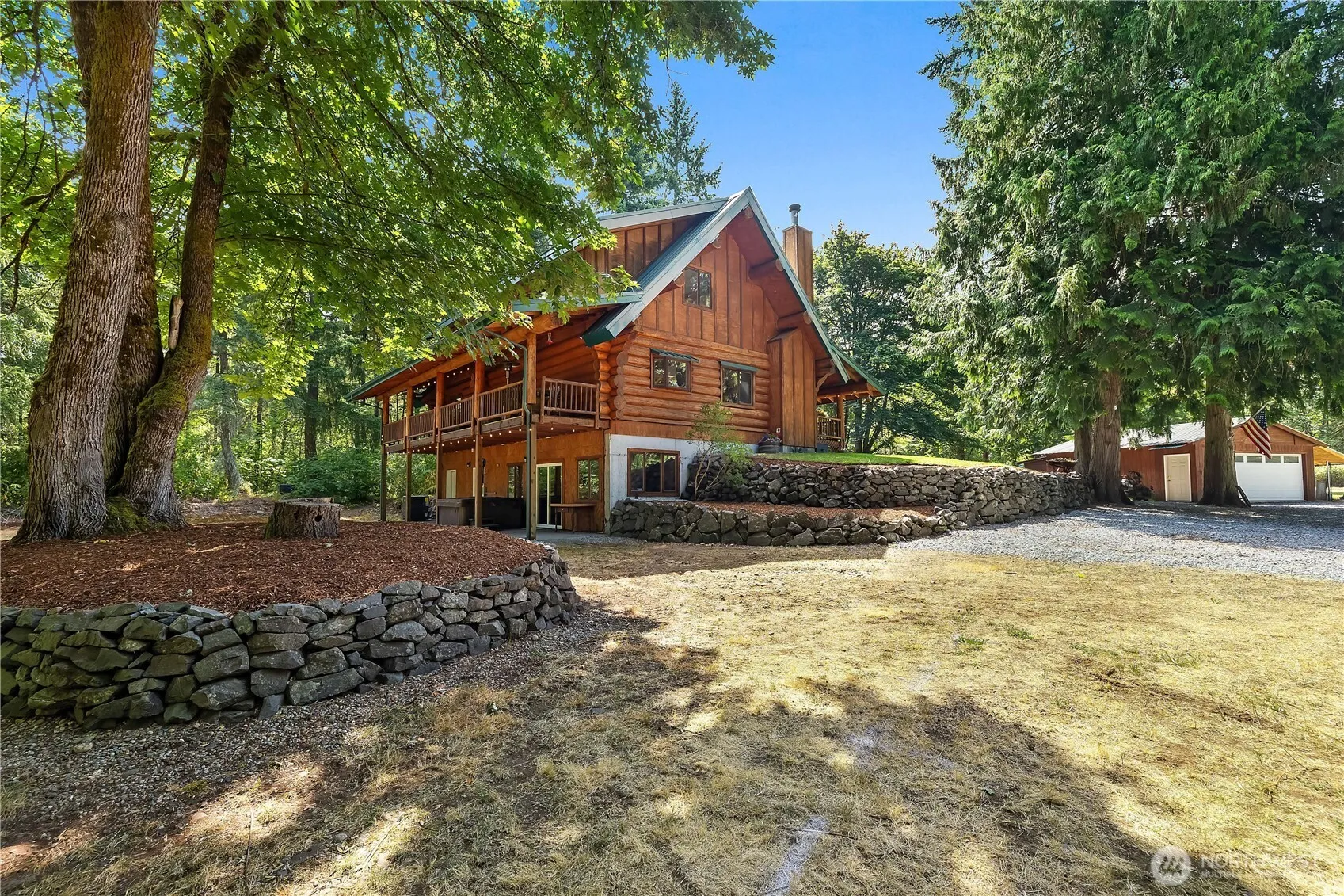 A captivating 3544 sq ft log home offering rustic charm and modern luxury. This Pacific NW retreat provides a privately gated and secluded 10+ acres. The multi-level functional design has 3 bedrooms, a den & 3 bathrooms. Large windows and skylights invite natural light and offer breathtaking views of the surrounding landscape. The gourmet kitchen boasts custom wood cabinetry, high-end appliances, and stunning countertops. A focal point of the living area is the stone fireplace, perfect for cozy nights and gatherings. The primary suite is a private sanctuary, complete with spa-like bathroom, walk-in closet, and dedicated balcony. Multiple viewing decks and patio with hot tub for outdoor enjoyment. Bonus: Oversized garage with shop.