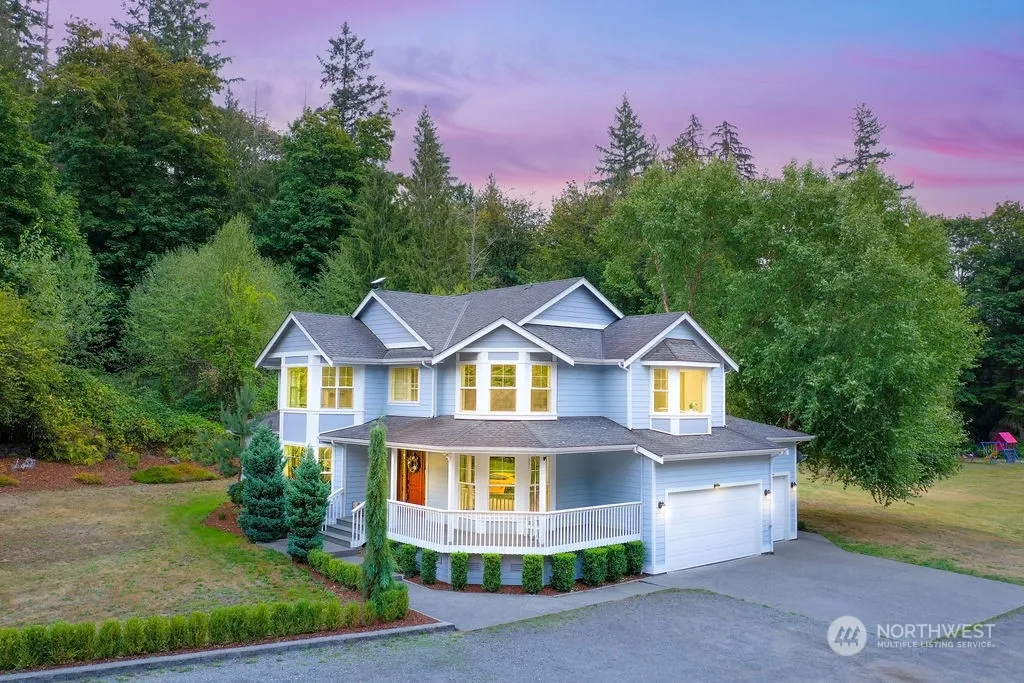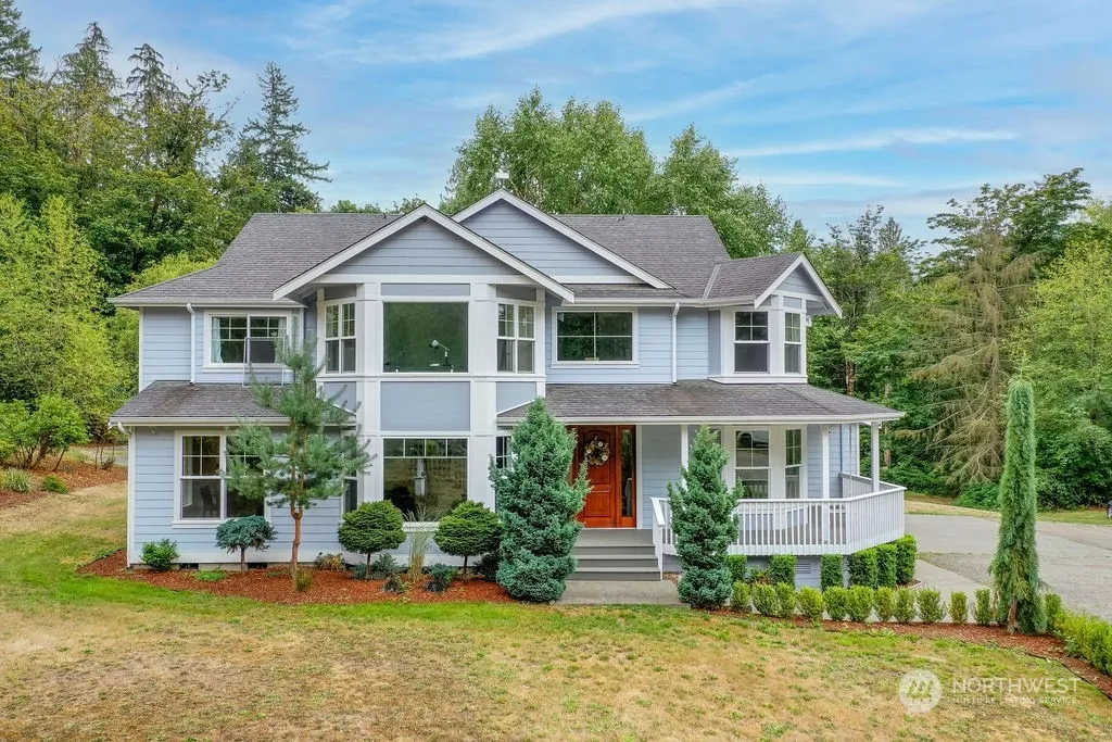 Exquisite, Unparalleled Estate nestled on 21+ Acres! Extra long, tree-lined driveway leads to Idyllic Modern Victorian Farmhouse! Completely remodeled w/dreamy wraparound porch & Sunroom off back. Beautiful, large windows grant an abundance of light throughout home! Classic white kitchen w/Farmhouse Sink, heated tile floor, quartz counters, movable island, tile backsplash & SS appliances. Professionally landscaped & lovingly maintained grounds. Sprawling Backyard w/patio, huge open space, detached playhouse/study & fire pit. Two water heaters, A/C & built in vacuum. Unincorporated King County area; desirable Lake Moneysmith community, two separate parcels included in sale; Bring all your dreams to life with this amazing estate!